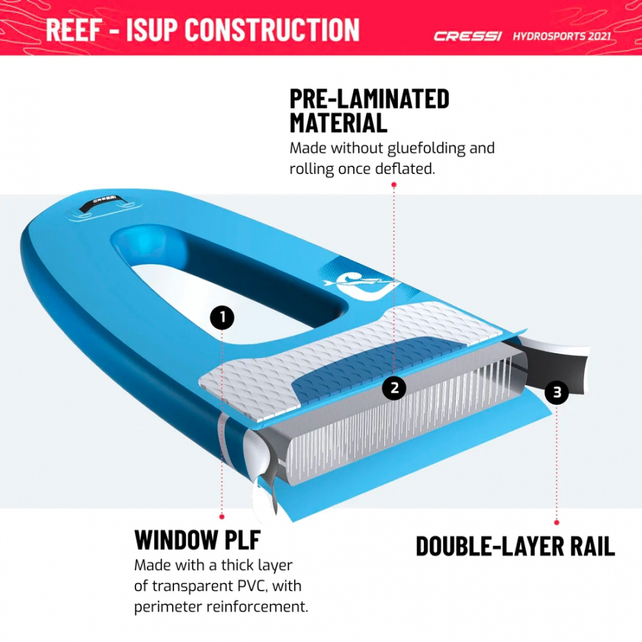 Pilnīga snorkelēšanas pieredze no virszemes: jauna perspektīva zemūdens vides sastapšanai un vērošanai ar maksimālu cieņu. Šis ir rifs, jaunais Cressi logs ir līdz šim lielākais logs. Lielā 34 collu "zivs" forma kopā ar iepriekš laminētu materiālu ir ļāvusi mums izveidot iegarenu logu, kas stiepjas no airēšanas pozīcijas līdz priekšgalam, un, pateicoties izturīgajam kristāldzidra PVC slānim, rifa logs piedāvā izcilu skatu. Lielais peldspēja, izliektais priekšgals un dāsns 9" dreifs nodrošina dēļam lielisku stabilitāti, lai jūs varētu ērti apbrīnot jūru, lai kur jūs dotos. Tehnoloģija: cressi logs plf lielākais logs isup kategorijā, kas izstrādāts, pateicoties cressi pieredzei dēļu izstrādē ar atverēm. Izgatavots no cieta, bieza caurspīdīga PVC slāņa ar perimetra stiegrojumu, tā izmēri ir paredzēti, lai novērstu deformācijas un strukturālos trūkumus. Turklāt, pateicoties iepriekš laminētajam materiālam bez līmēšanas un divslāņu sliedei, rifs piedāvā maksimālu skata laukumu un komfortu airēšanas laikā.